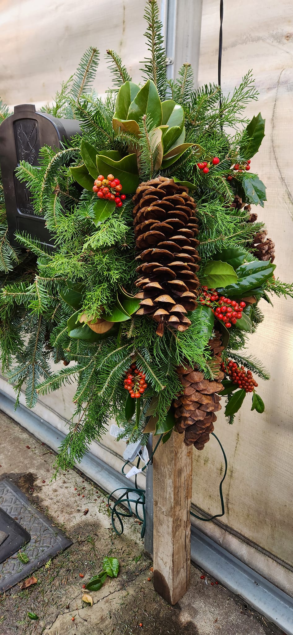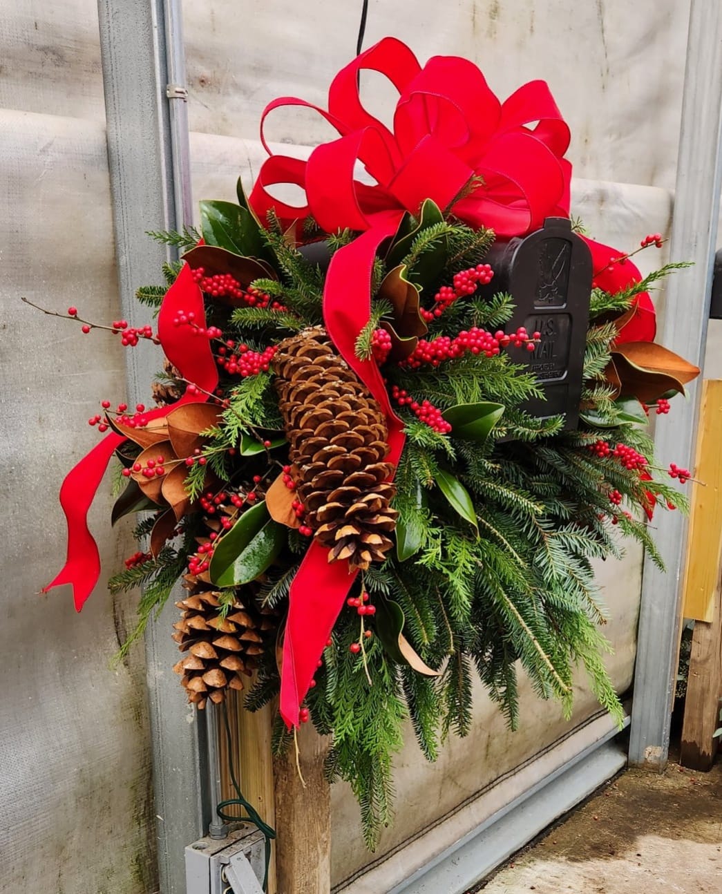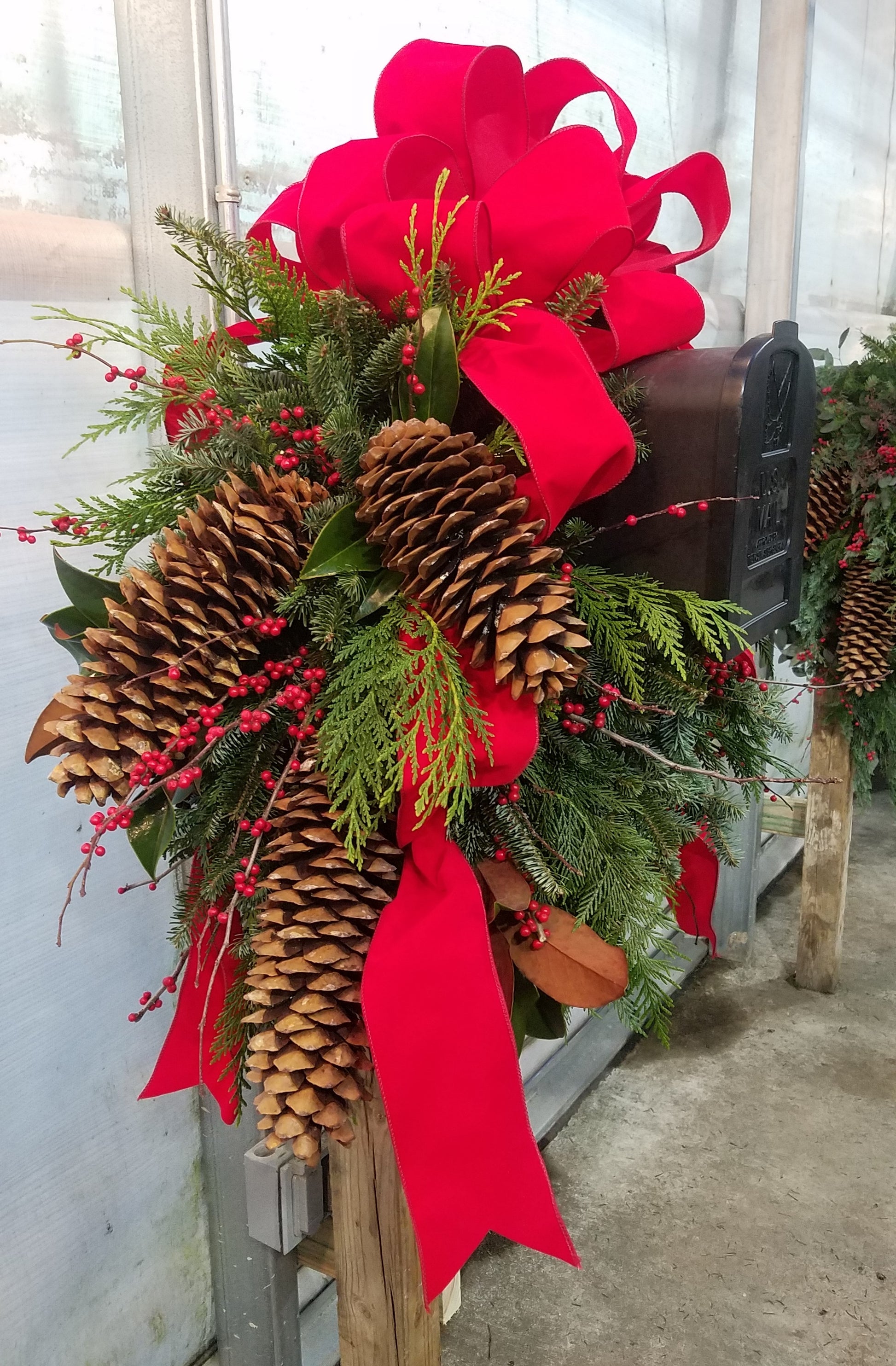 Spruce up your mailbox with our Small Mailbox Saddle! This seasonal beauty features fresh winter greenery, bright red berries, and charming pinecones. Bring a touch of nature to your curb with this playful and festive addition. (Hurry, supplies are limited!)