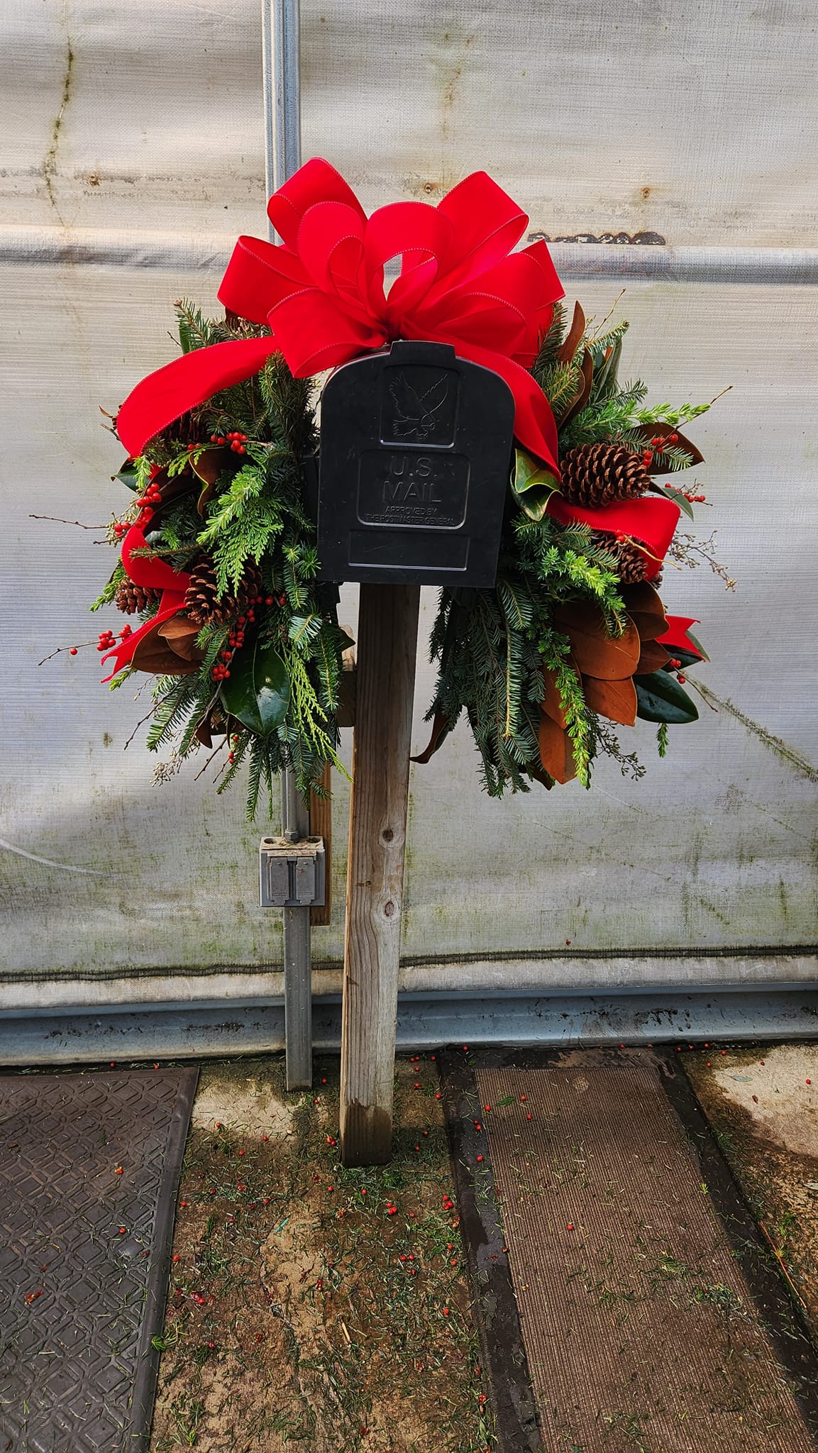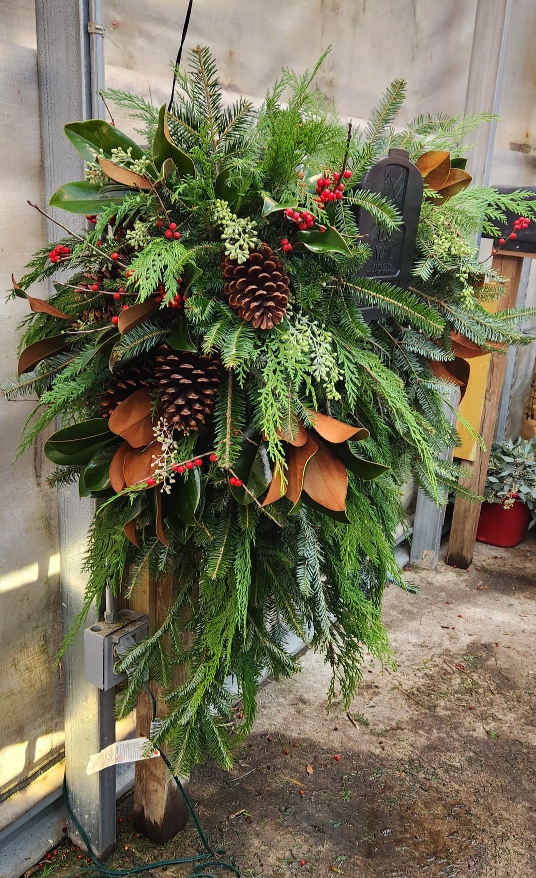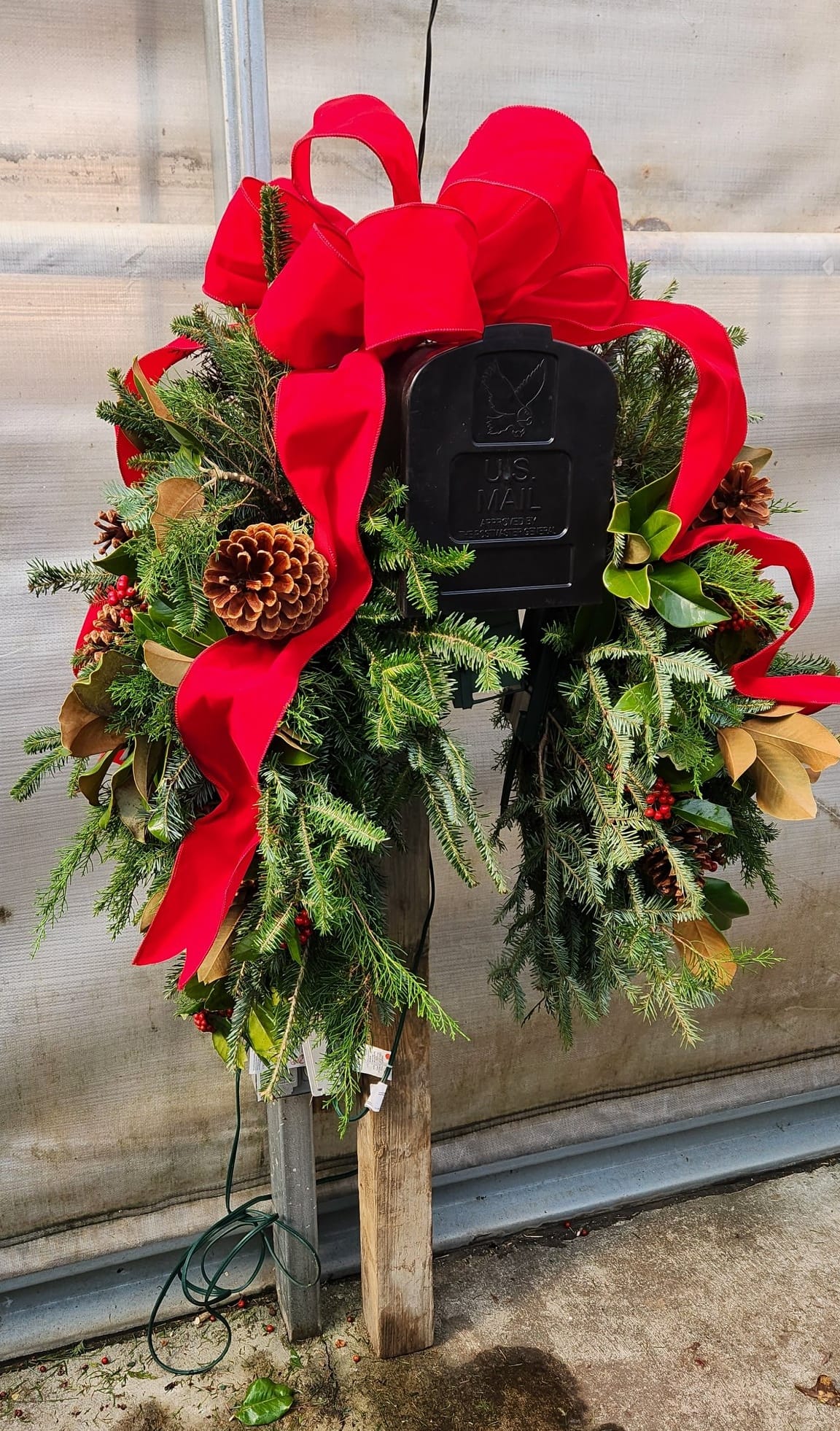 Spruce up your mailbox with our Small Mailbox Saddle! This seasonal beauty features fresh winter greenery, bright red berries, and charming pinecones. Bring a touch of nature to your curb with this playful and festive addition. (Hurry, supplies are limited!)