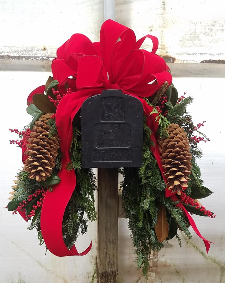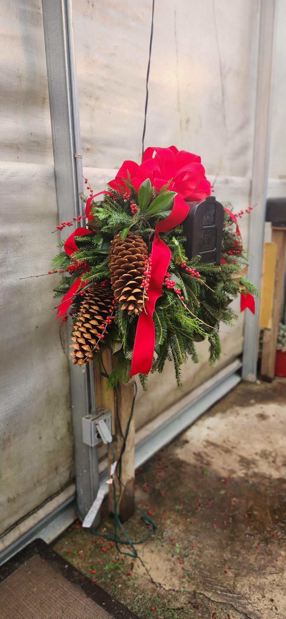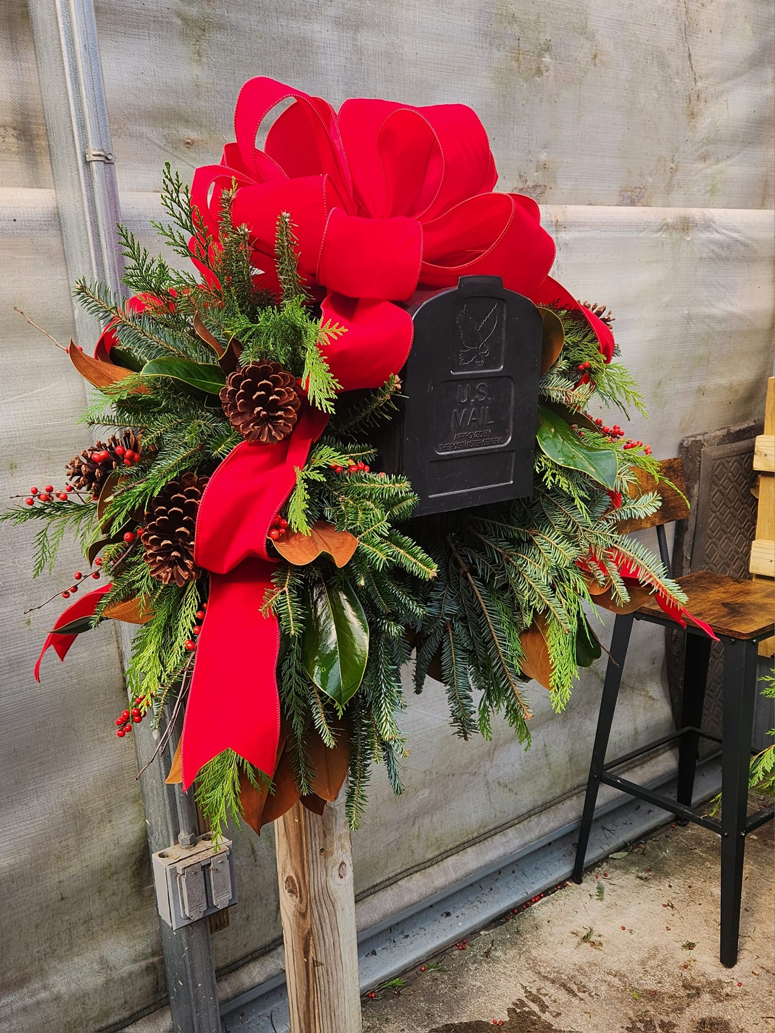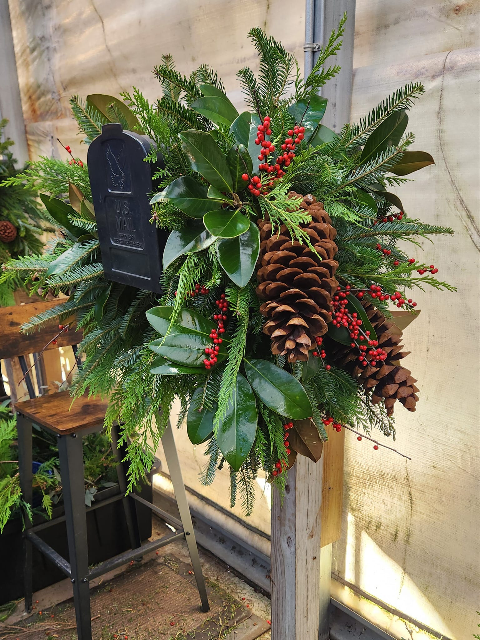 Spruce up your mailbox with our Small Mailbox Saddle! This seasonal beauty features fresh winter greenery, bright red berries, and charming pinecones. Bring a touch of nature to your curb with this playful and festive addition. (Hurry, supplies are limited!)