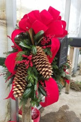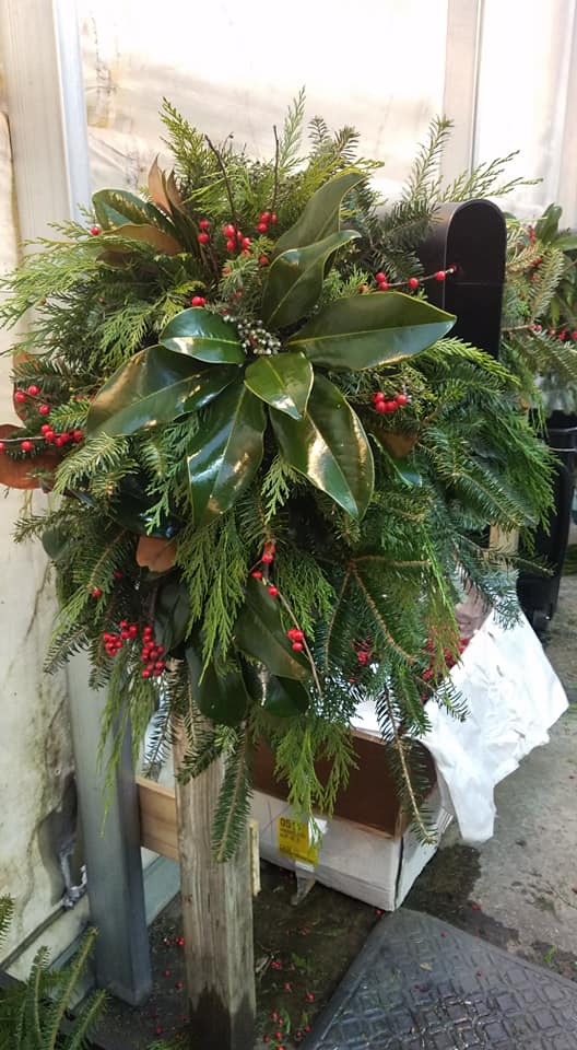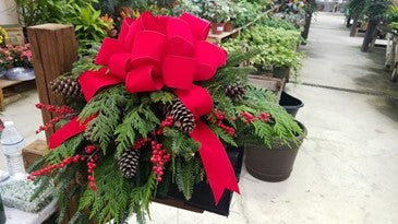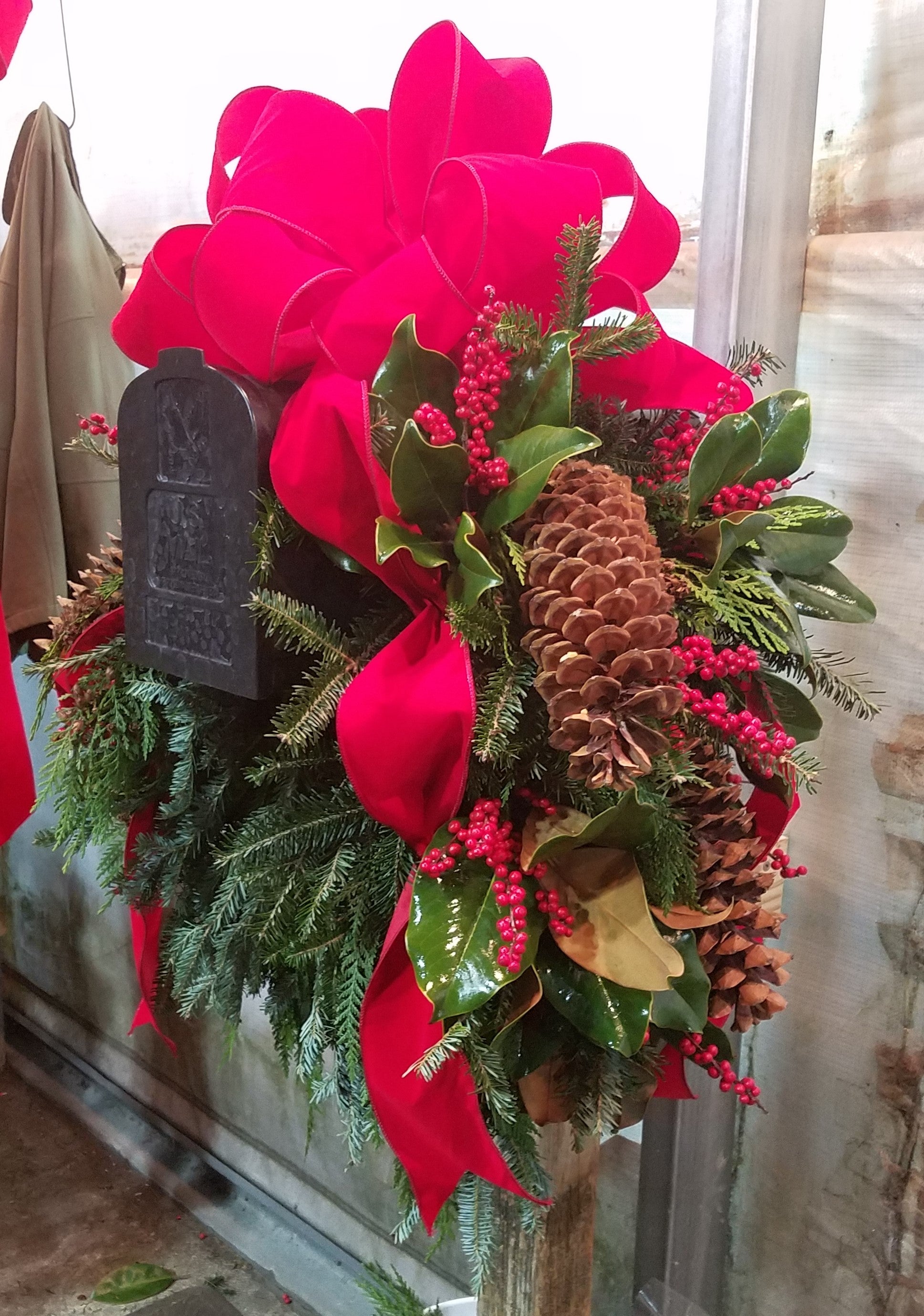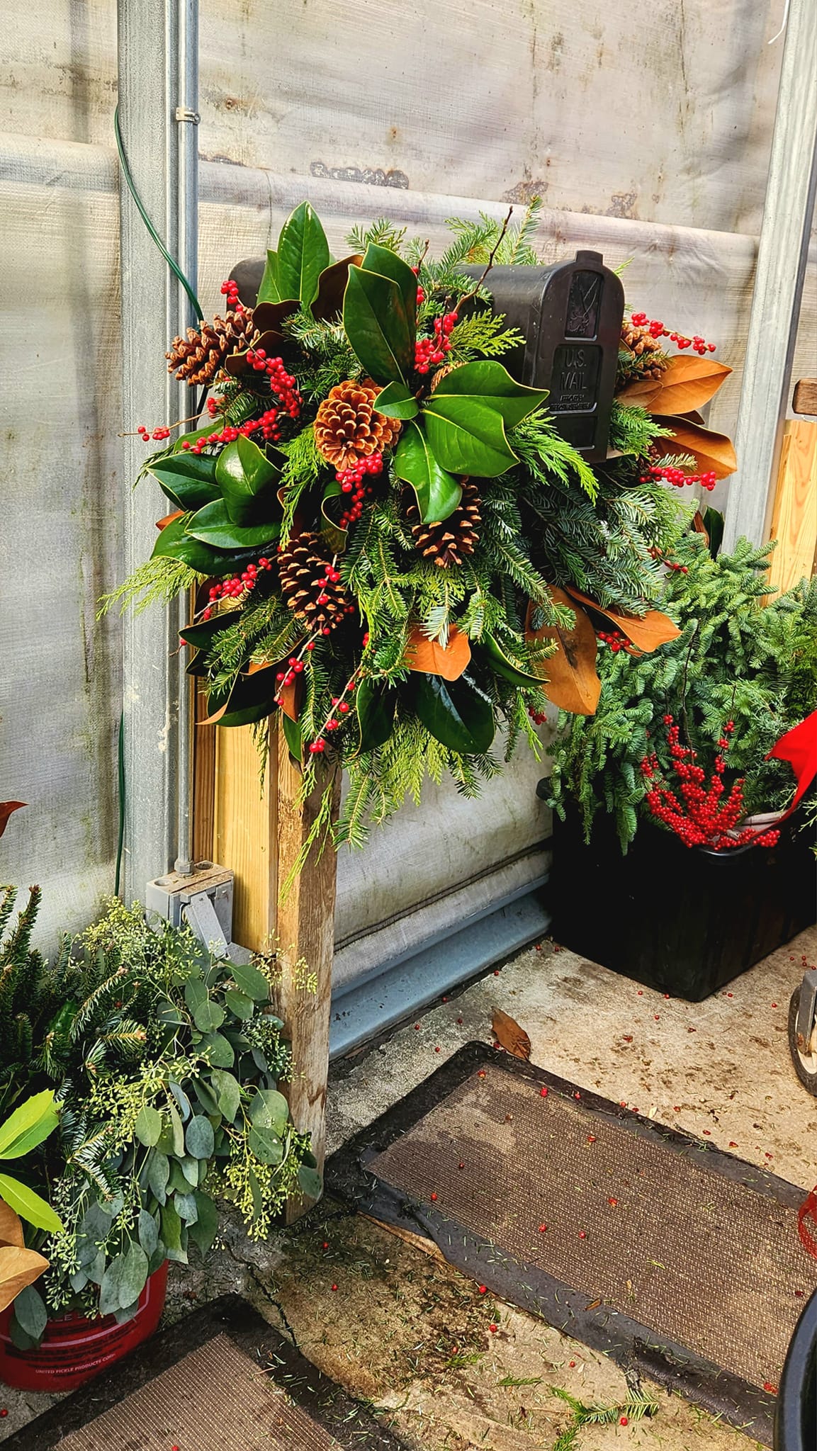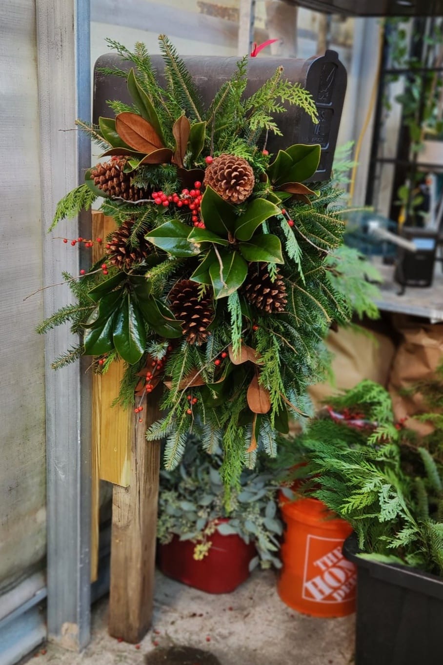 Spruce up your mailbox with our Small Mailbox Saddle! This seasonal beauty features fresh winter greenery, bright red berries, and charming pinecones. Bring a touch of nature to your curb with this playful and festive addition. (Hurry, supplies are limited!)